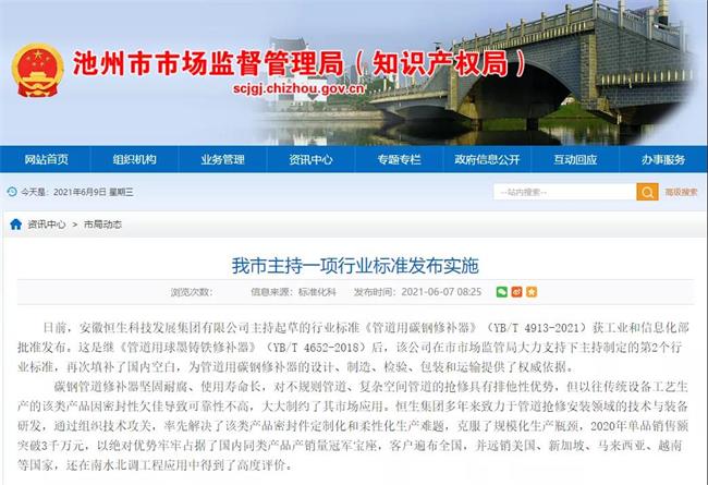 恒生集團多年來致力于管道搶修安裝領域的技術與裝備研發,并已發展成為集微電子、機械、化工及彈性體密封件制造等為一體,擁有多家控股子公司的多元化、現代化企業。恒生集團是“安徽省高新技術企業”和“國家知識產權優勢企業”,是多種材料標準的主要起草單位,2015年國家工信部批準了由恒生集團主持起草《管道用球墨鑄鐵修補器》的國家行業標準,該標準將于2018年9月開始實施,這對引導國內管道修補器行業的發展有著積極而深遠的意義。